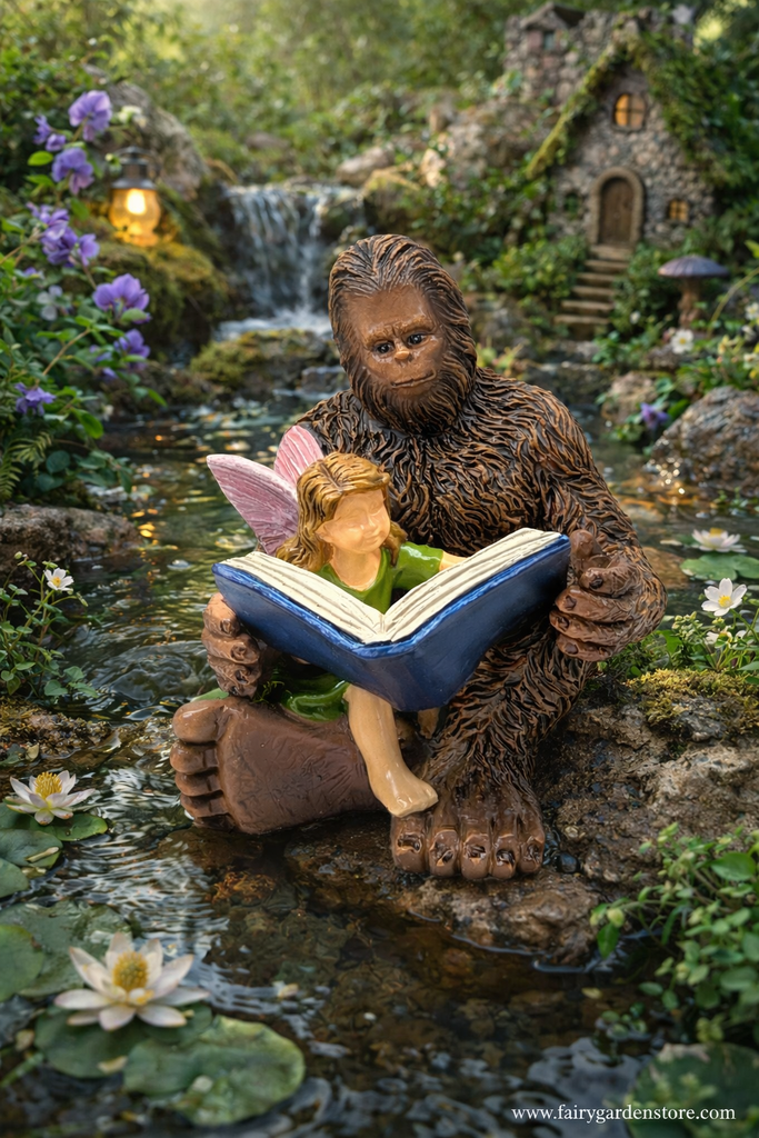 This delightful scene features a friendly Sasquatch (Bigfoot) seated comfortably in an Indian-style pose, with a sweet fairy girl perched on his lap as she reads aloud from a blue storybook. The moment captures warmth, curiosity, and wonder—perfect for fairy gardens that tell a story of kindness, learning, and enchantment.