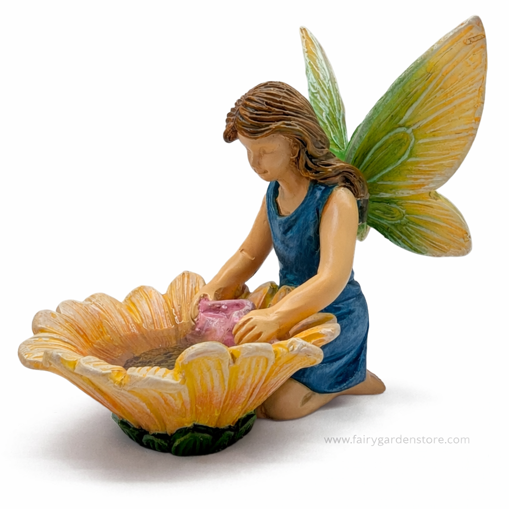 Standing 3 inches tall, this beautifully detailed figurine is rich with storytelling charm — from the gentle curve of her wings to the delicate textures of the flower petals and flowing fabric. The warm colors and thoughtful pose make Wash Day a delightful focal point in fairy gardens, terrariums, planters, and miniature village displays.