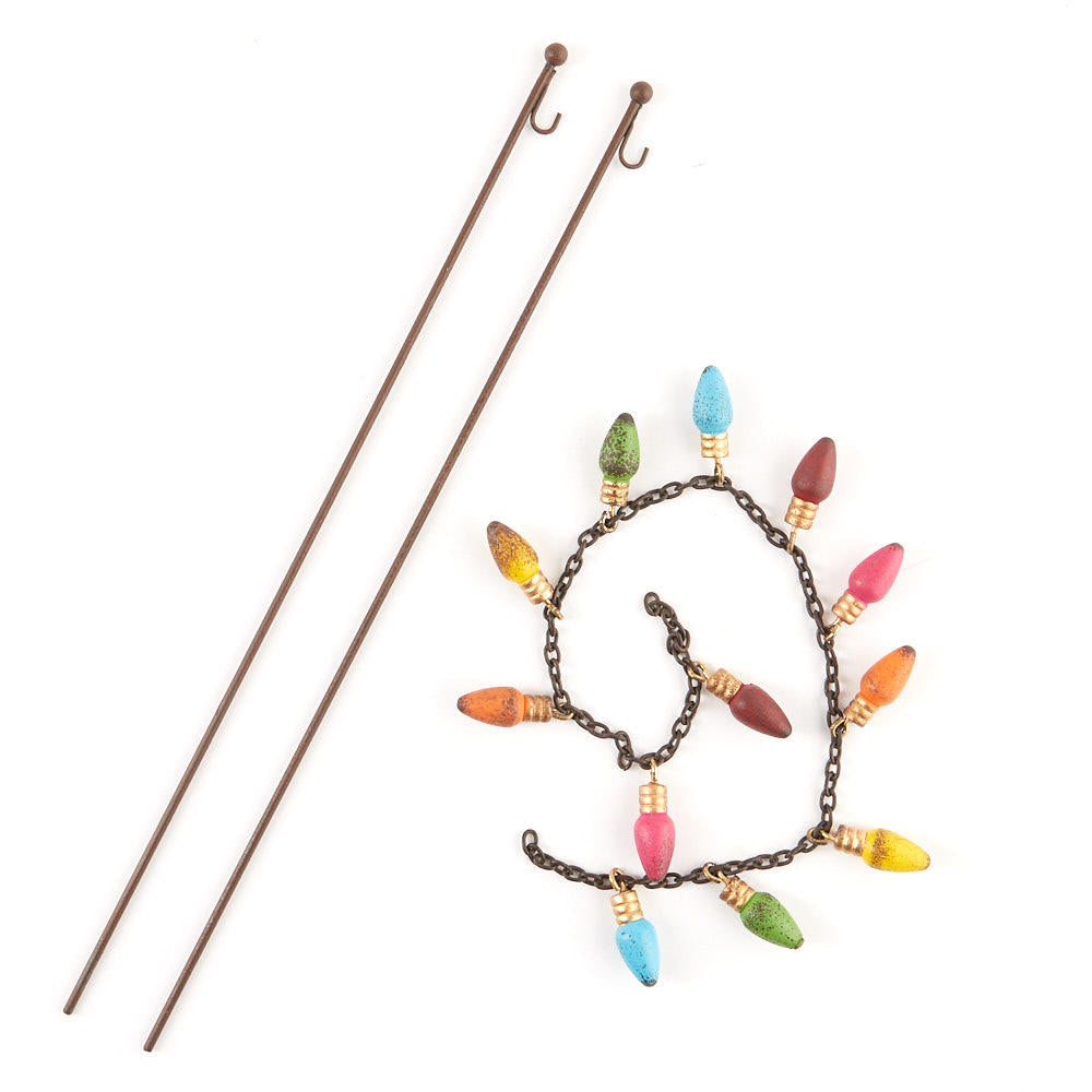 This Miniature String of Non-Working Party Lights features 12 colorful painted bulbs hanging from a chain suspended between two metal posts with hooks. Perfect for miniature Christmas displays, campground dioramas, or scaled patio scenes, it adds a festive touch. Size: Bulbs: 7/8" x 5/16" Dia. Posts: 9" String of lights: 11" Painted with all-weather paint for indoor or outdoor use. Non-working decorative item.