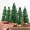 These Frosted Green Bottle Brush Trees bring a soft, whimsical charm to seasonal decorating. With a dark green hue and a light snow-glazed finish, these trees add a vintage-inspired touch to any display. Size: 5 inches tall (bottom of base to top of tree)